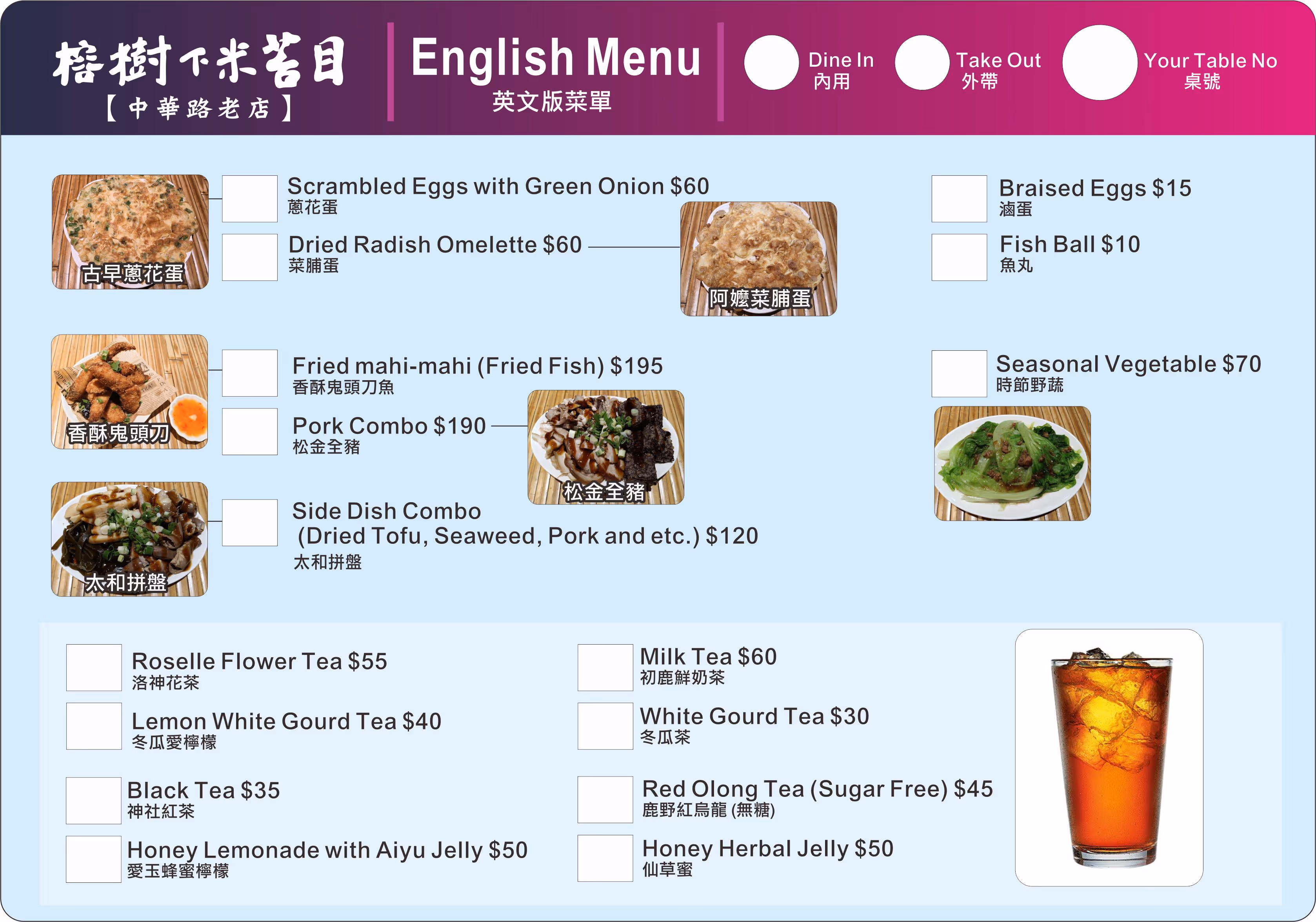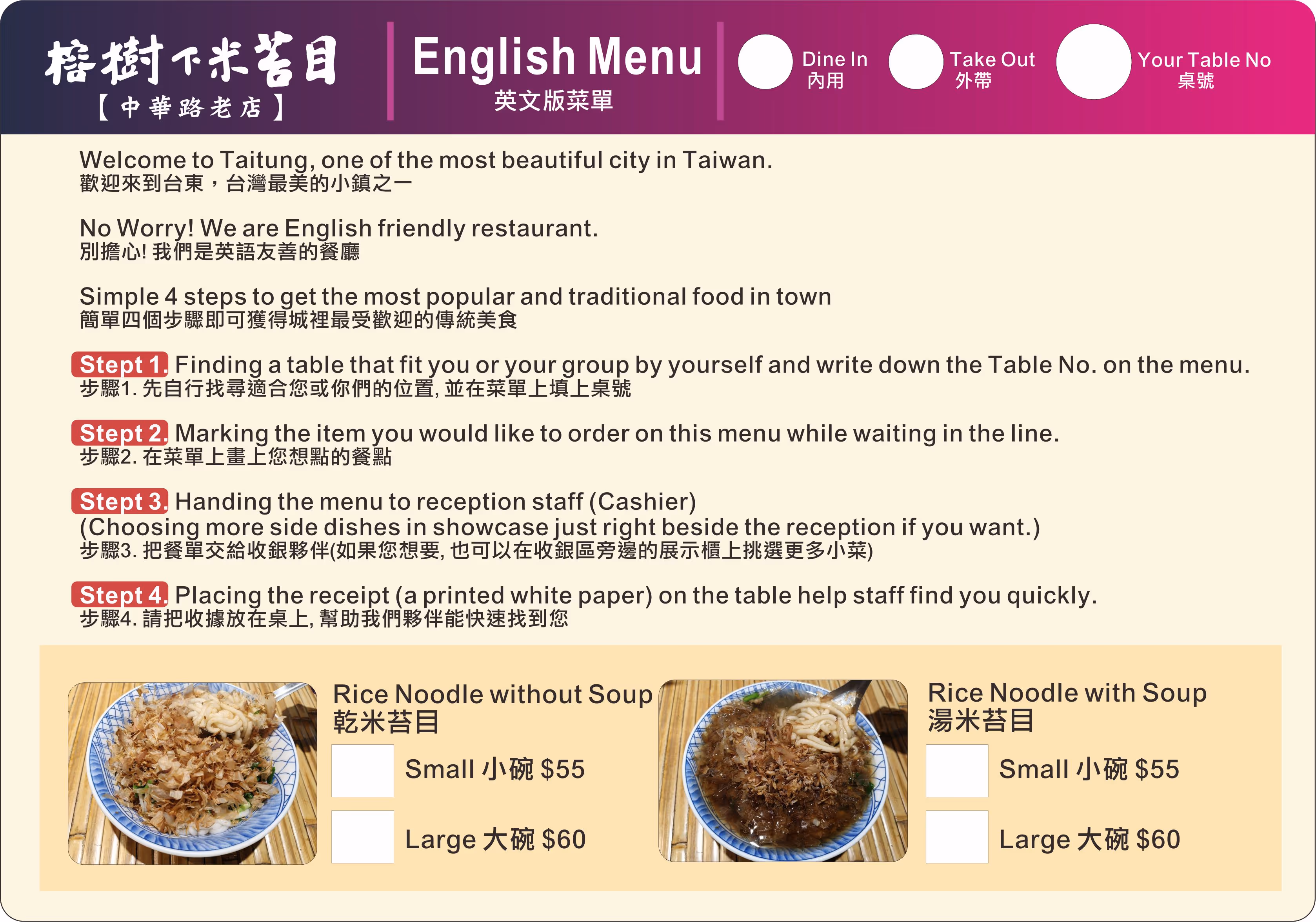 店內販售乾的米苔目與湯的米苔目兩種,皆分為小碗 $55、大碗 $60,大碗只多$5份量更足非常划算。建議搭配滷蛋一顆$15或加點太和拼盤$120,一碗米苔目配一份小菜就是最滿足的經典組合,兩人用餐總消費約$200-$300之間。