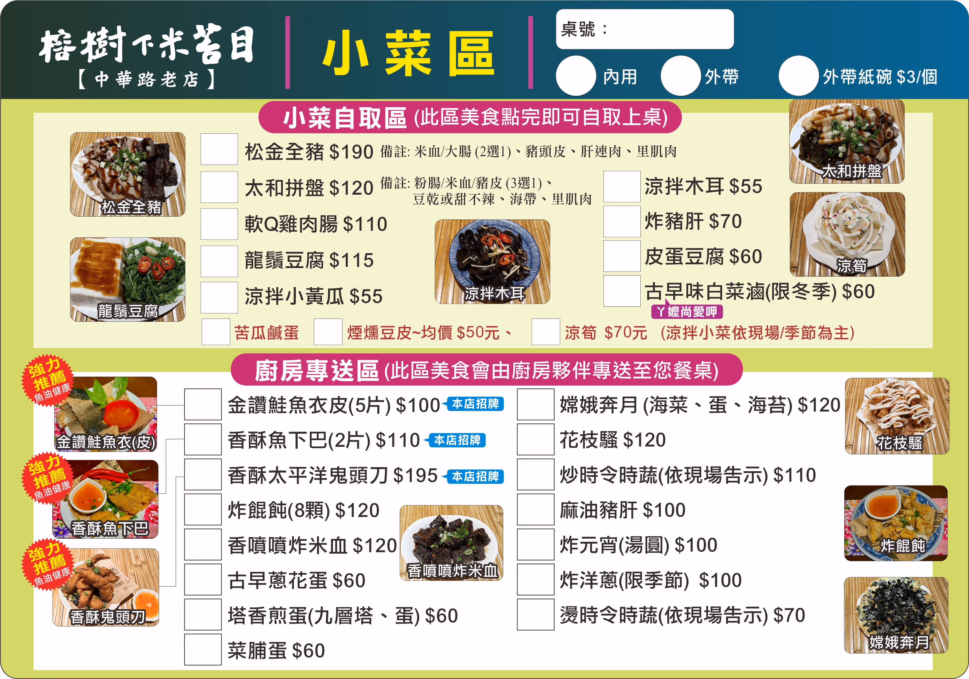 廚房專送區的招牌菜包括:金讚鮭魚衣皮 ($100)、香酥魚下巴 ($110) 以及香酥太平洋鬼頭刀 ($195),外酥內嫩淋泰式酸辣醬超開胃。滷味區的松金全豬 ($190) 選用關山東方明豬,有豬腱肉、肝連、豬耳朵、大腸四種部位,太和拼盤 ($120) 則是兩人份的最佳選擇,CP值最高。